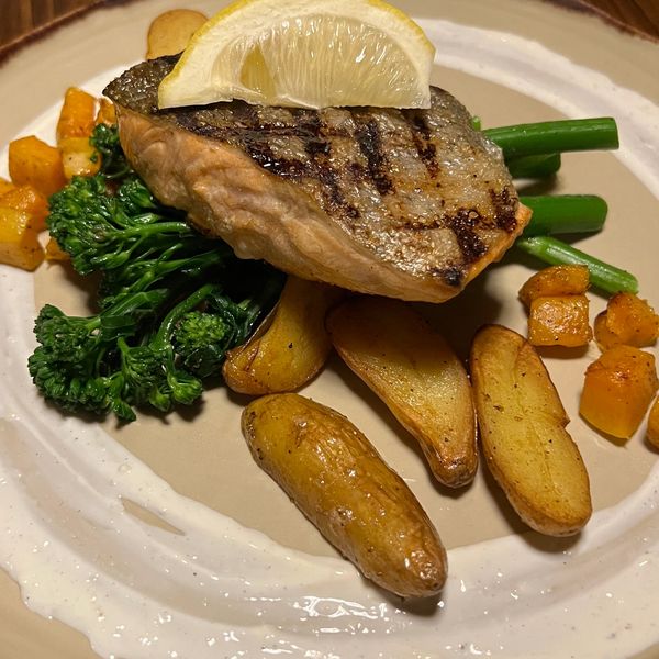 9 ounce Canadian Angus striploin, shallot butter, grilled onion, Burbank chips, sautéed vegetables
